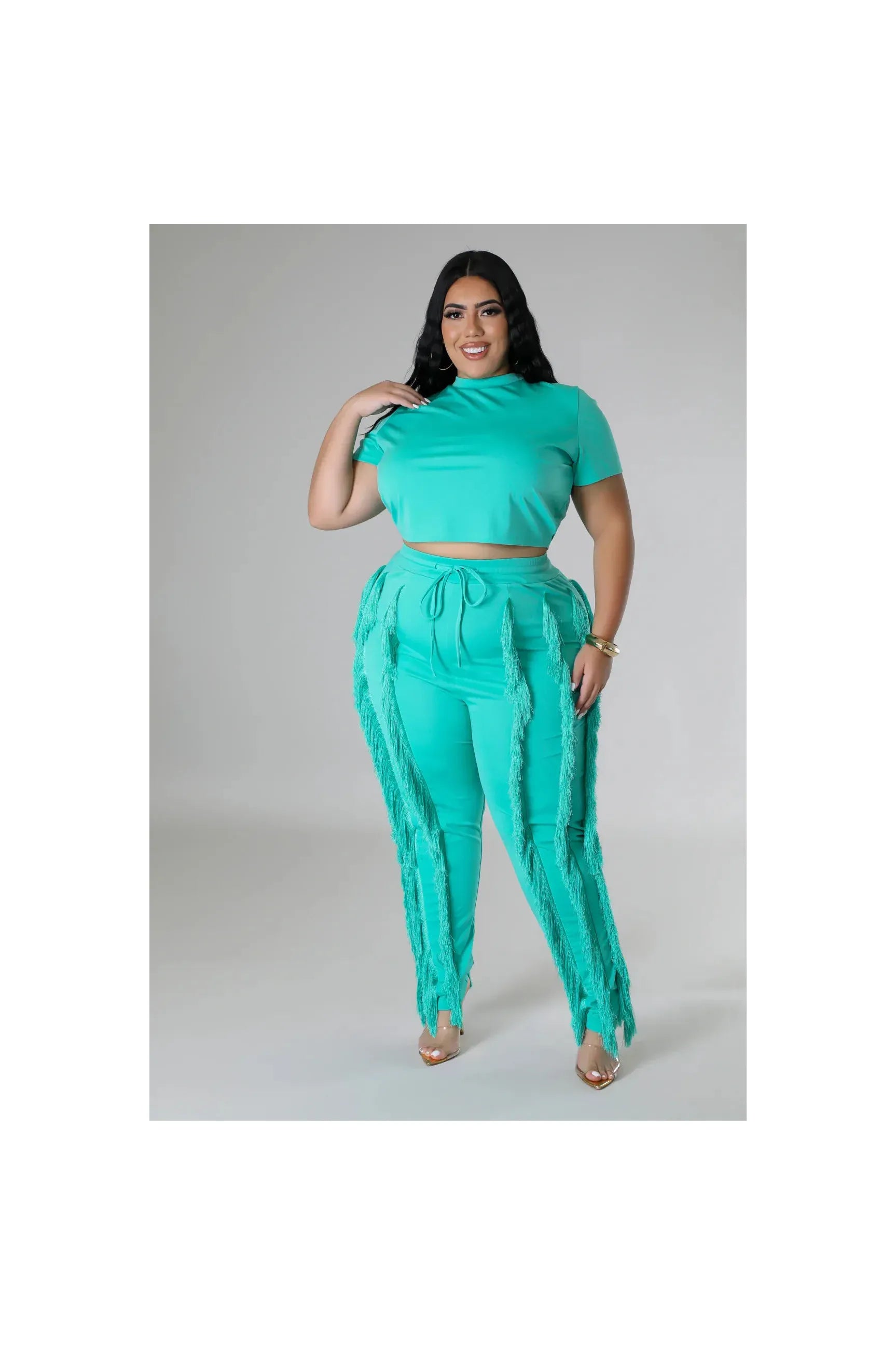 This bold and stylish two-piece set offers a modern and edgy look. Featuring a cropped top with a classic crew neckline, the set is paired with high-waisted pants that bring a touch of drama with their long, fringe detailing down the sides.